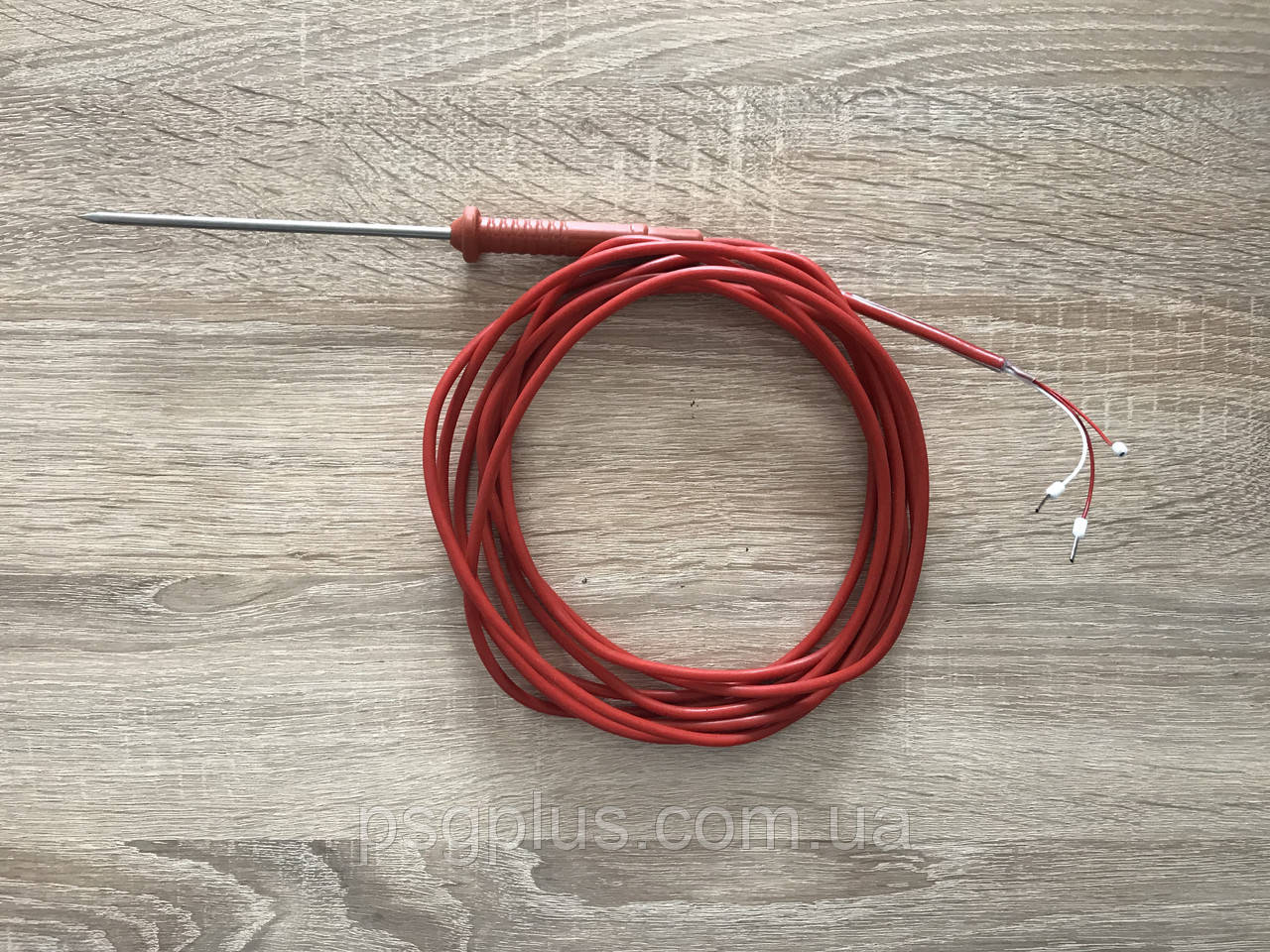 Термодатчик для вимірювання температури у виробах, що є на термічній обробці в коптильно-варювальних камерах і жаркових шафах, виготовлених за тридротовою схемою під'єднання на платиновому терморезисторі Pt 100, який поміщений в арматуру з неіржавкої сталі діаметром 4 мм, завдовжки 100 мм, кабель силіконовий термостійкий, завдовжки 4000 мм, або під замовлення.